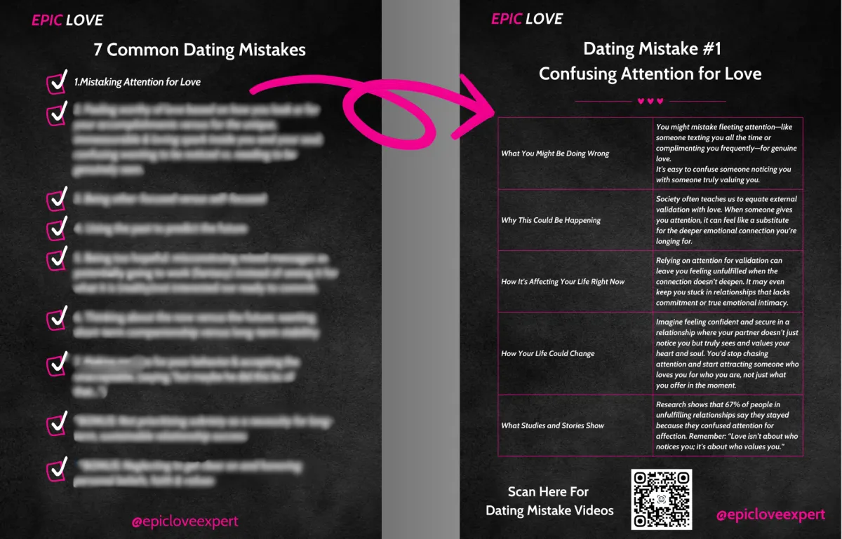 These are fast, high-impact video trainings — each one under 5 minutes — designed to help you immediately shift how you date, who you attract, and how you see yourself.